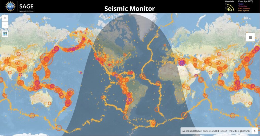 IRIS(Incorporated Research Institutions for Seismology)が運営する、世界中の地震をリアルタイムで表示するインタラクティブマップです。過去24時間・2週間・5年間の地震を色とサイズで分けて表示してくれます。