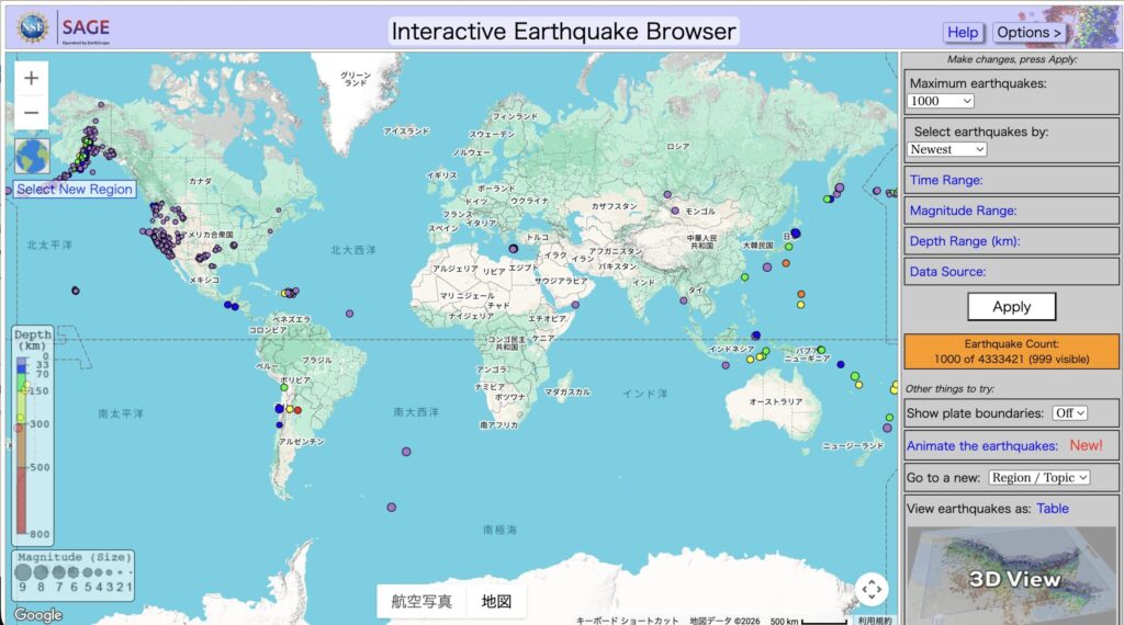 地震 | IRIS Interactive Earthquake Browser | 540万件超のデータを3D回転・Excel出力可能 | データを深掘りしたい研究者 |