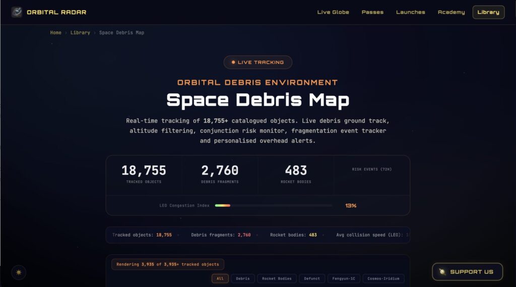45,000以上の追跡オブジェクトをリアルタイムで表示する、デブリ監視に特化したサイトです。LEO(低軌道)、MEO(中軌道)、GEO(静止軌道)の全域をカバーしています。