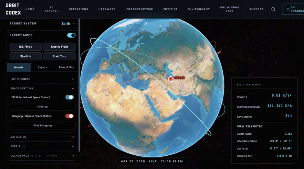 スペースデブリ | Orbit Codex | ISS、天宮、ハッブルなどを3Dでリアルタイム表示 | 特定の衛星を追いたい方 |