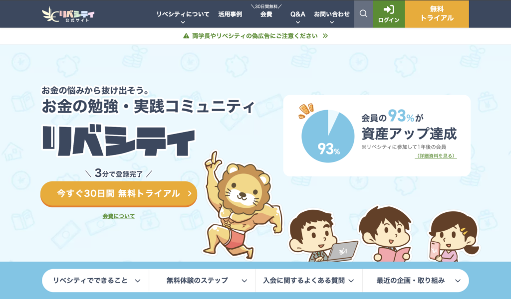 リベシティは、お金や生活をテーマにした大規模コミュニティです。2019年頃に始まり、学び・交流・助け合いを目的として活動しています。公式サイトでは会員区分や特典について説明されています。