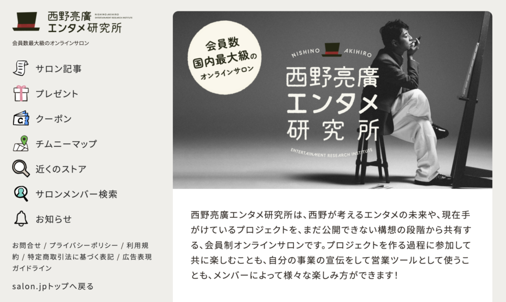 | 西野亮廣エンタメ研究所(西野亮廣) | 2016年頃 | エンタメやプロジェクト作りを軸に、参加者が企画や挑戦に関われるコミュニティ。 |