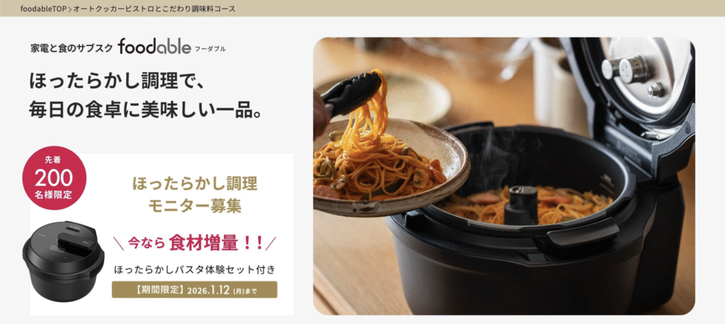 オートクッカーBistroサブスク は、具材を入れるだけで煮込み・炒め・圧力調理まで完結する便利家電。さらにfoodableから専用調味料が届き、レシピ選びの手間も省けます。