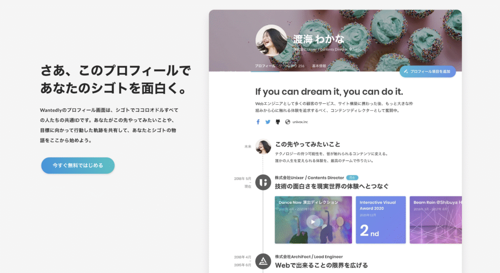 Wantedly(ウォンテッドリー)は、「SNS型の転職サイト」です。SNS型の特徴は、応募者の自己紹介ページを作り、企業側に人柄や実績を見てもらったうえで互いにコンタクトを取り合える仕組み。