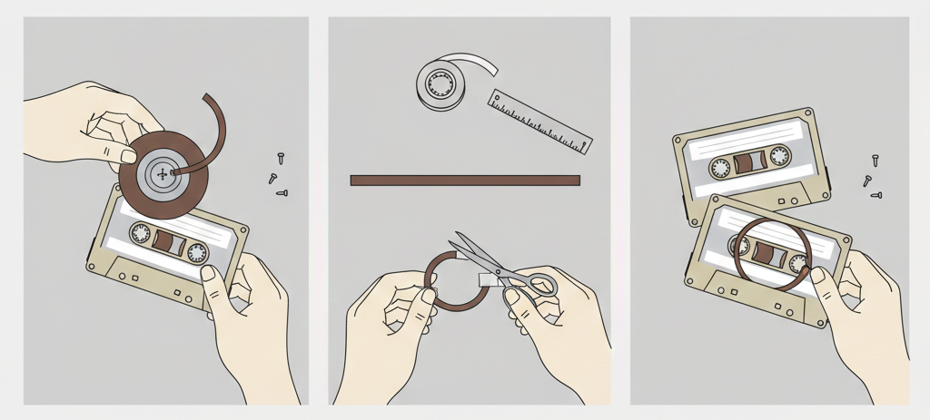カセットテープを活用した究極のクリエイティブがカセットテープ・ループです。テープを物理的に切り貼りし、無限に同じフレーズを繰り返す楽器へと改造します。
